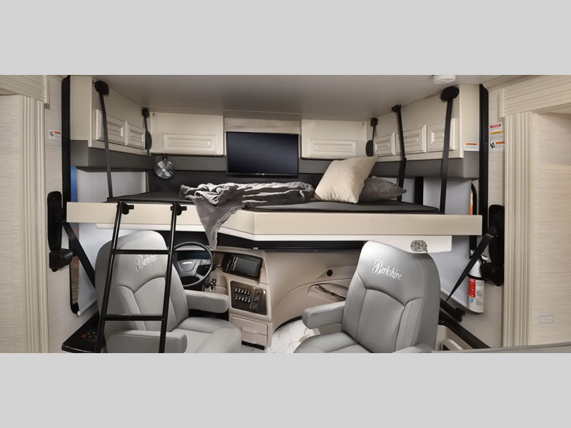 Berkshire 34B  Forest River Berkshire Class A diesel motorhome 34B highlights: Overhead Bunk ... more about Berkshire 34B Have a question about this floorplan? Contact Us SpecificationsSleeps 6 Slides 3 Length 35 ft 5 in Ext Width 8 ft 4 in Ext Height 12 ft 8 in Int Height 7 ft Exterior Color Full Body Paint Options; Forest, Mink, Pewter, Sapphire, Scarlet Hitch Weight 10000 lbs GVWR 32400 lbs Fresh Water Capacity 103 gals Grey Water Capacity 66 gals Black Water Capacity 42 gals Generator 8kW Onan Diesel Fuel Type Diesel Engine Cummins ISB Turbo Diesel 6.7L Chassis Freightliner XCR Raised Rail Horsepower 360 hp Fuel Capacity 100 gals Wheelbase 206 in Number Of Bunks 1 Available Beds Tilt-A-View King Torque 800 ft-lb Refrigerator Type Double Door Residential Convection Cooking Yes Cooktop Burners 2 Number of Awnings 2 Axle Weight Front 12600 lbs Axle Weight Rear 20000 lbs LP Tank Capacity 82 lbs Water Heater Type Truma Continuous TV Info Cab 32" LED TV, LR 43" LED TV, BR 32" LED TV, Exterior 32" LED TV Awning Info 18' Carefree Latitude Dual Pitch Patio w/Led Lt & Wind Sensor Washer/Dryer Available Yes Gross Combined Weight 42600 lbs Shower Type Standard Electrical Service 50 amp Similar Floorplans