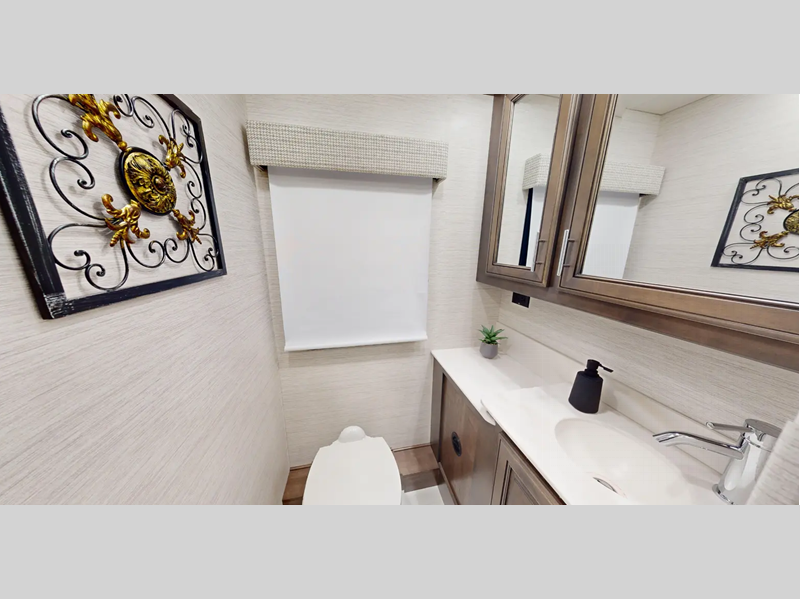 The Tru-Brace Anti-Camber chassis support system, along with the aluminum tube frame with Azdel composite sidewall fiberglass provides a durable foundation so you can enjoy your coach for years. You will love the driver console wireless cellphone charger, and your passenger will have their own stow away workstation to keep them busy on the way to the campground. Some of the interior luxuries you are sure to love are the polished porcelain tile throughout, the decorative window valances, and the polished solid surface countertops with mosaic tile backsplash!