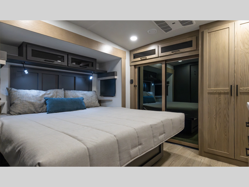 Sleeps 6 Slides 5 Length 40 ft Ext Width 8 ft Ext Height 13 ft 5 in Int Height 0 ft Hitch Weight 2145 lbs Dry Weight 11989 lbs Cargo Capacity 2156 lbs Fresh Water Capacity 54 gals Grey Water Capacity 131 gals Black Water Capacity 53 gals Tire Size 16" Furnace BTU 35000 btu Available Beds King Refrigerator Type 12V Cooktop Burners 3 Number of Awnings 1 LP Tank Capacity 30 lbs Water Heater Capacity 12 gal Water Heater Type Quick Recovery Auto Ignition Gas/Electric TV Info LR Televator Smart TV Awning Info 9' and 17' Power with Adjustable Rain Dump & LED Light Strip Axle Count 2 Washer/Dryer Available Yes Number of LP Tanks 2 Shower Type Shower w/Seat Electrical Service 50 amp Solar Wattage 200 watts Similar Floorplans